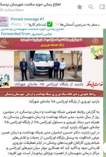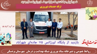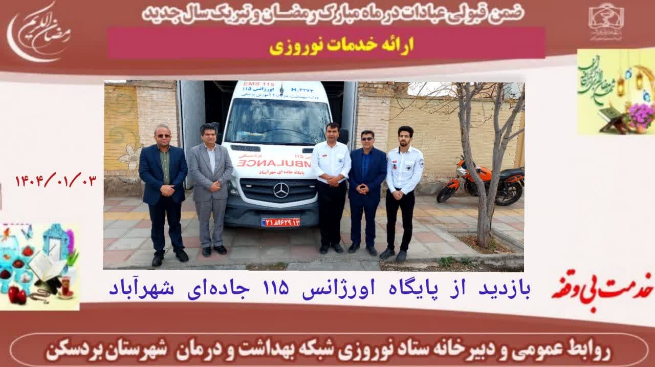 به گزارش روابط عمومی شبکه بهداشت و درمان بردسکن، در سومین روز از سال جدید، مدیر شبکه بهداشت و درمان شهرستان بردسکن به همراه دبیر ستاد نوروزی و مسئول اورژانس ۱۱۵ از پایگاه اورژانس ۱۱۵ جادهای شهرآباد بازدید کردند.
