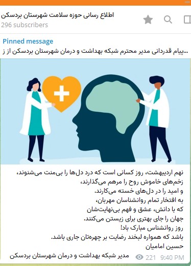 همزمان با نهم اردیبهشت ماه روز روانشناس، مراسم تجلیل از روانشناسان شاغل در شبکه بهداشت و درمان شهرستان بردسکن با حضور مدیر شبکه بهداشت و درمان، و جانشین فرماندهی ناحیه مقاومت بسیج سپاه شهرستان در محل سالن اجتماعات این شبکه برگزار شد.