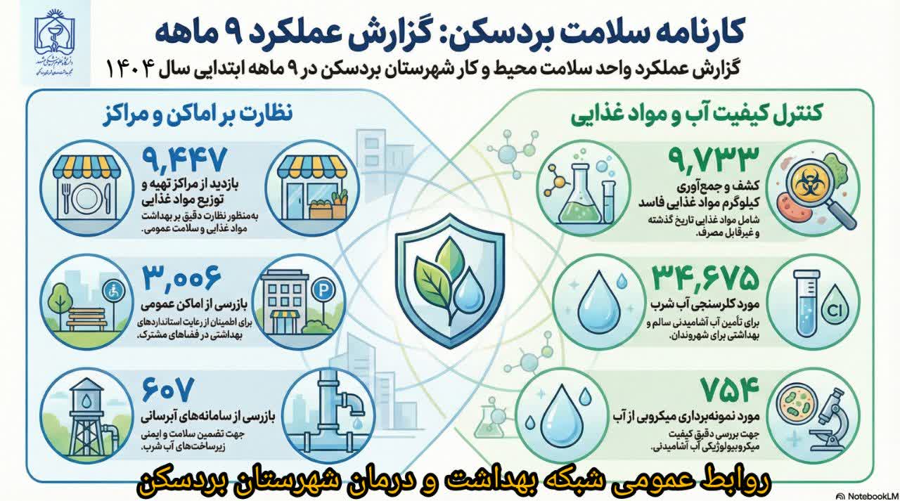 گزارش عملکرد واحد سلامت محیط و کار مرکز بهداشت شهرستان بردسکن از ابتدای سال ۱۴۰۴