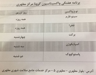 | بردسکن | خانه بهداشت | سیر | سیر | 7الی 13.30 | همه روزه به جز ایام تعطیل | سینوفارم | |