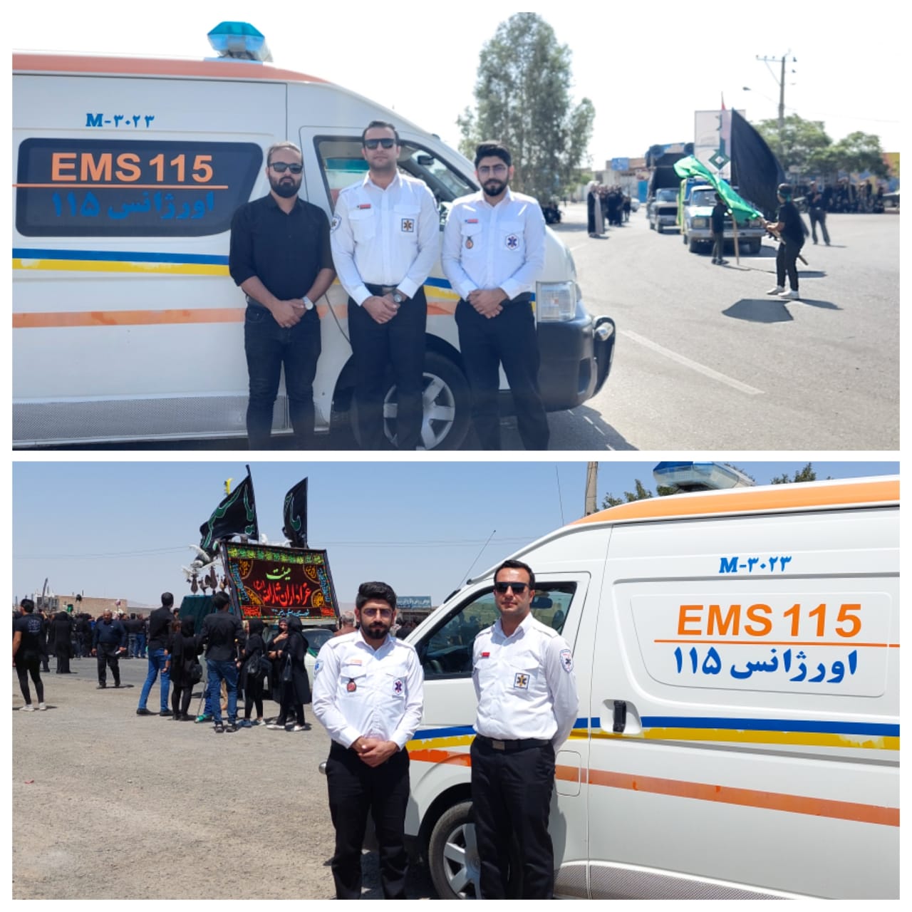 پرسنل اورژانس ۱۱۵ با یک دستگاه آمبولانس در مسیر دسته روی هیئات مذهبی شهرستان به سمت گلزار شهدا مستقر و به ارائه خدمات به عزاداران سرور و سالار شهیدان پرداختند.