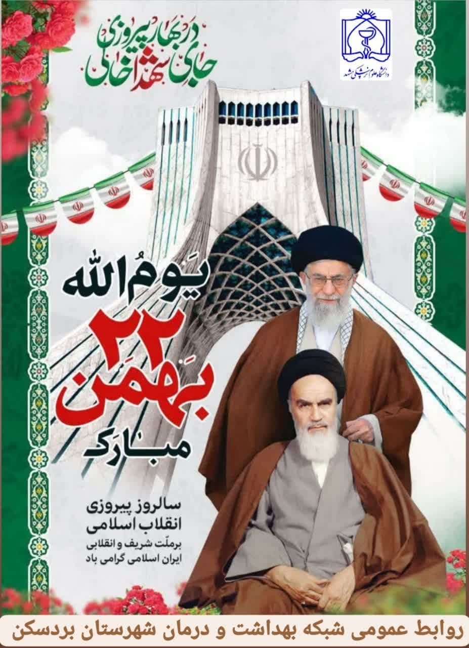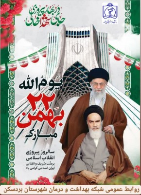 اینجانب ضمن گرامیداشت یاد و نام بنیانگذار نظام مقدس جمهوری اسلامی حضرت امام خمینی(ره) و شهدای انقلاب اسلامی و شهدای مدافع سلامت با افتخار و مباهات، فرارسیدن چهل و چهارمین سالگرد پیروزی انقلاب اسلامی ایران و یوم الله ۲۲ بهمن را محضر رهبر فرزانه انقلاب اسلامی حضرت آیت الله خامنه ای ( دامت برکاته)، ملت غیور ایران اسلامی ، خانواده های معظّم شهداء، جانبازان، آزادگان، رزمندگان و ایثارگران و همکاران محترم و معزز در مجموعه شبکه بهداشت و درمان و همچنین مردم متدیّن و ولایت مدار شهرستان تبریک و تهنیت عرض نموده و توفیقات روز افزون ملت ایران را در مسیر پاسداشت این نقطه عطف از تاریخ انقلاب اسلامی در سایه توجّهات حضرت ولیعصر(عج) و پیروی از فرامین حکیمانه مقام معظّم رهبری (مدظلّه العالی) ، از درگاه خداوند سبحان مسئلت می نمایم.