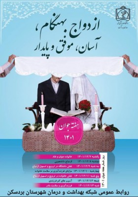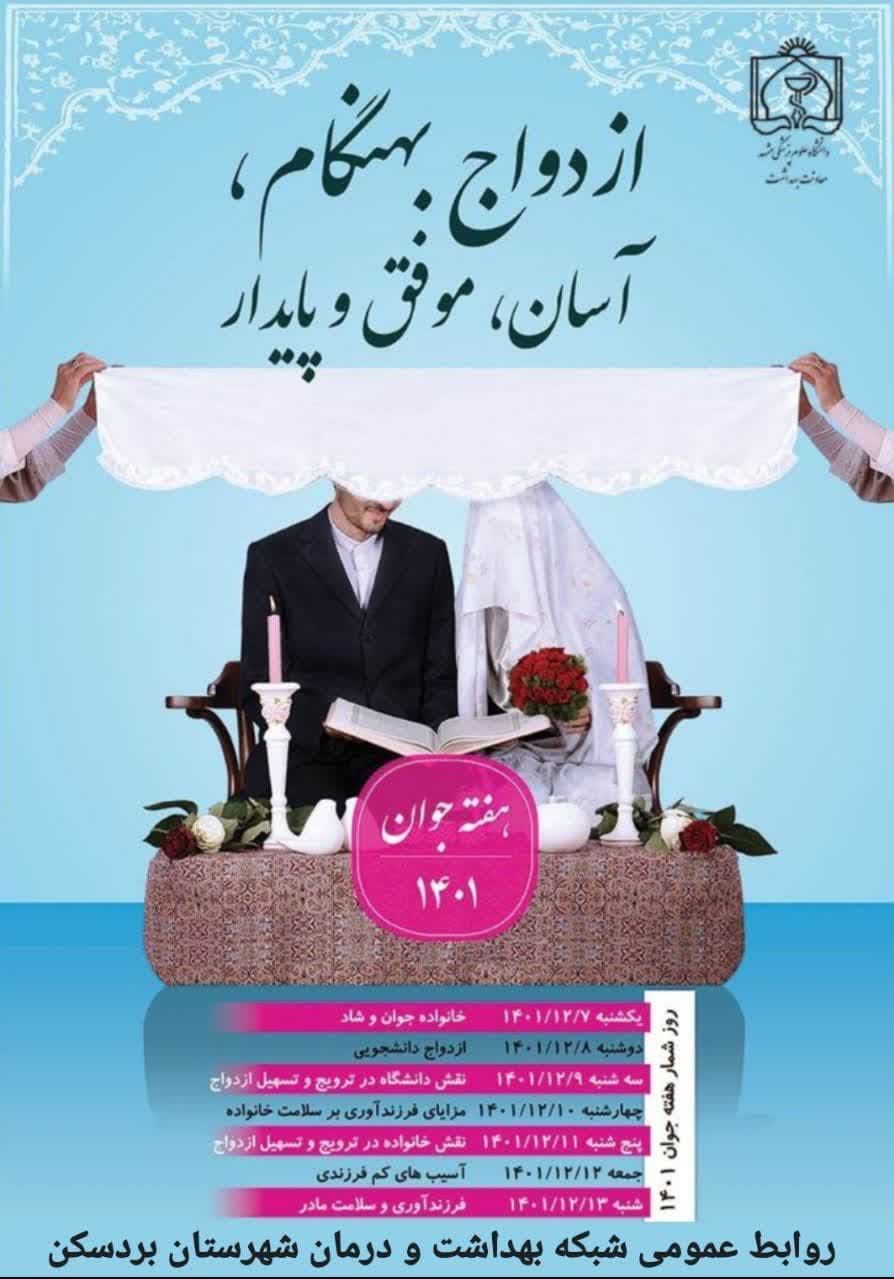 شعار امسال هفته بزرگداشت جوان ازدواج بهنگام ،آسان ، موفق و پایدار نامگذاری شده است که باید در راستای سیاست های ابلاغی جوانی جمعیت گام برداشت.