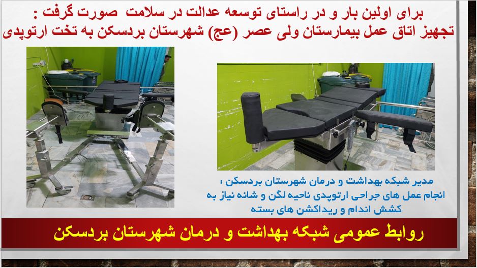 برای اولین بار و در راستای توسعه عدالت در سلامت در مناطق محروم صورت گرفت ؛ تجهیز اتاق عمل بیمارستان ولی عصر(عج) شهرستان بردسکن به تخت ارتوپدی