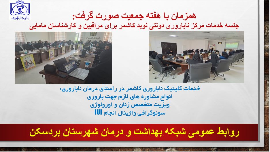 با توجه به اهمیت برنامه جوانی جمعیت و تاثیر بسزایی که توجه به زوجین نابارور میتواند در پیشبرد اهداف این برنامه داشته باشد،با راه اندازی مرکز ناباروری دولتی نوید کاشمر، همزمان با هفته ملی جمعیت، برای ماماها و ماما مراقبین مرکز بهداشت شهرستان بردسکن جلسه توجیهی خدمات این مرکز برگزار شد.