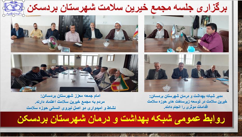 جلسه اعضای مجمع خیرین سلامت با حضور حجت الاسلام والمسلمین امینی امام جمعه معزز شهرستان بردسکن، دکتر محمدرضا رضا نژاد مدیر شبکه بهداشت و درمان ، حاج محمود مدرس مدیر عامل مجمع خیرین سلامت و دیگر اعضاء در محل شبکه بهداشت و درمان برگزار گردید