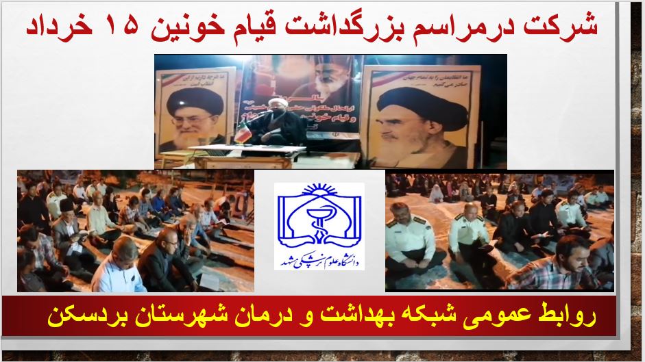 پرسنل شبکه بهداشت و درمان در مراسم عزاداری و گرامیداشت قیان خونین ۱۵ خرداد شرکت نمودند اینمراسم در جوار مرقد مطهر شهدای گمنام پارک ولی عصر (عج) بردسکن و با حضور مردم شریف و مسئولین شهرستان برگزار شد، اقامه نماز جماعت مغرب و عشا، قرائت قرآن، دعای پر فیض زیارت عاشورا، سخنرانی حجتالاسلام مصوری امام جمعه موقت شهرستان، قرائت بیانیه از طرف دانش آموز و مداحی توسط مداح اهلبیت از برنامه هدی اینمراسم معنوی بود.