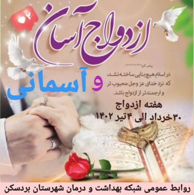سالروز خجسته ازدواج حضرت علی (ع) و حضرت فاطمه (س) و آغاز هفته ازدواج را تبریک عرض نموده و زندگی توام با سرافرازی و موفقیت را برای همه جوانان میهن عزیز اسلامی در ظل توجهات حضرت ولی عصر(عج) و در پرتو منویات رهبر معظم انقلاب اسلامی ( مد ظله العلی ) از درگاه خداوند متعال مسئلت می نمایم.