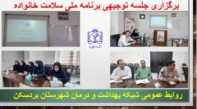 جلسه ای که با حضور کارشناسان ستادی مرکز بهداشت برگزار گردید در ابتدا درباره برنامه ملی سلامت خانواده و اقداماتی که در این راستا انجام شده است مطالبی بیان شد. سپس در ارتباط با بازدیدهای ماهانه از مراکز و واحدها و پیگیری هایی که باید انجام شود توضیحاتی ارائه شد.