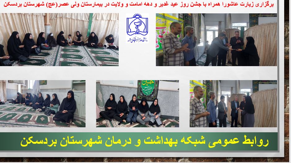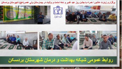 همزمان با دهه امامت و ولایت و فرا رسیدن روز عید غدير خممراسم زیارت عاشورا به همراه جشن این عید بزرگ با حضور همکاران شبکه بهداشت و درمان، بیمارستان ولی عصر(عج) و مرکز بهداشت در محل نمازخانه بیمارستان ولی عصر(عج) برگزار گردید در این مراسم ضمن قرائت زیارت عاشورا و مراسم جشن به قید قرعه به دوستداران اهل بیت (ع) که در این مراسم معنوی حضور داشتند هدایایی به رسم یادبود اهدا شد.