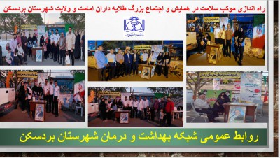 همزمان با دهه امامت و ولایت و روز عید غدیر خم موکب سلامت در محل همایش و اجتماع بزرگ طلایه داران امامت و ولایت راه اندازی گردید در این موکب ارائه مشاوره های بهداشتی از قبیل بیماری های منتقله بین انسان و حیوان ، التور، تب کریمه کنگو، جوانی جمعیت و فرزنداوری و برنامه ملی سلامت خانواده انجام شد.کنترل فشار خون ، نصب بنرهای آموزشی و استقرار تیم فوریت های پزشکی اورژانس ۱۱۵ از دیگر برنامه های موکب سلامت در مسیر همایش و اجتماع بزرگ طلایه دارن امامت و ولایت شهرستان بردسکن در روز عید غدیر بود.