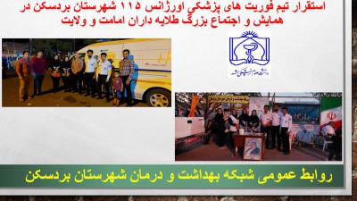 اکیپ اورژانس ۱۱۵ شهرستان در موکب سلامت همایش و اجتماع بزرگ طلایه داران امامت و ولایت همزمان با روز عید غدیر خم مستقر و ارائه اقدامات پیش بیمارستانی را انجام دادند.