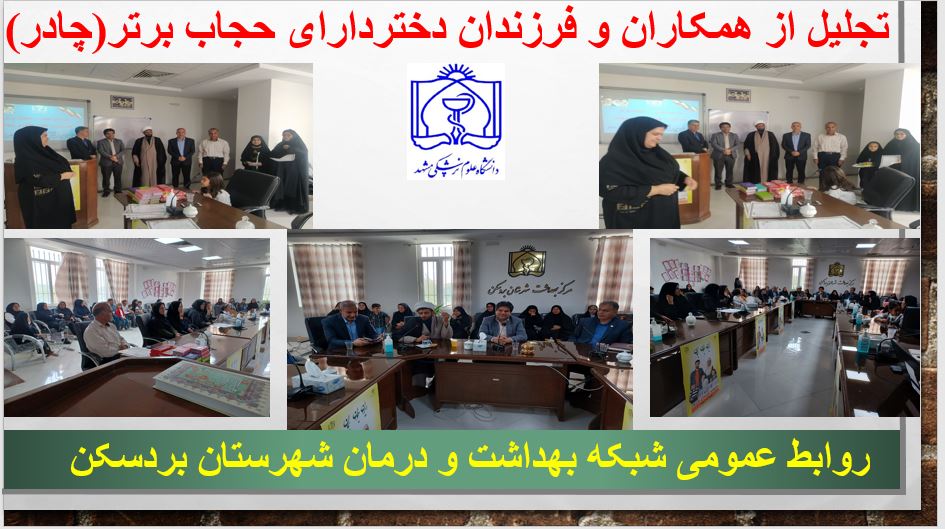 از همکاران و فرزندان دختر دارای حجاب برتر (چادر) و فرزندان همکاران که در راستای عفاف و حجاب نقاشی کشیده بودند قدردانی شد در اینمراسم که با حضور معاونین بهداشت و درمان شبکه ، امام جماعت شبکه و تعدادی از همکاران ستادی برگزار شد رئیس مرکز بهداشت در سخنانی ضمن گرامیداشت هفته عفاف و حجاب بیان داشت دشمنان انقلاب و نظام بنیان خانواده را نشانه رفته اند و برای بی حجابی و بد حجابی تبليغات زیادی انجام دادند که متاسفانه امروز شاهد حضور افراد بی حجاب در سطح جامعه هستیم.