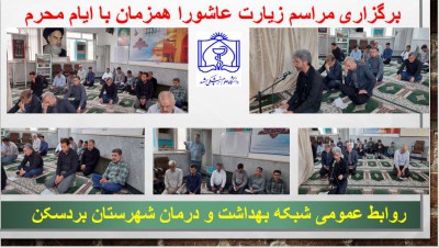 همزمان با دهه اول محرم روزانه مراسم زیارت عاشورا و مدیحه ثرایی همزمان با ایام شهادت سرور و سالار شهیدان حضرت اباعبدالله الحسین علیه السلام و یاران باوفایش و با حضور خواهران و برادران شبکه بهداشت و درمان، مرکز بهداشت و بیمارستان ولی عصر(عج) برگزار میگردد.