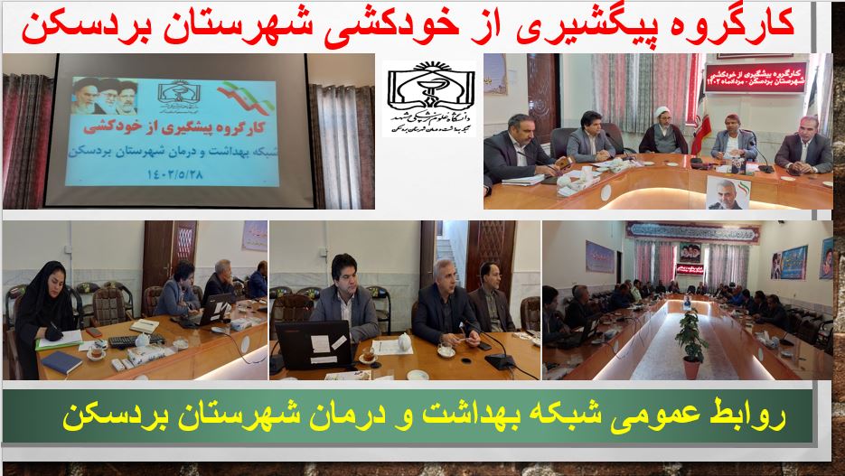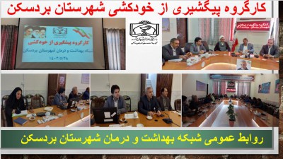 کارگروه پیشگیری از خودکشی با حضور حجت الاسلام والمسلمین امینی امام جمعه شهرستان بردسکن ، دکتر دهقان زاده فرماندار ، مهندس حسین امامیان رئیس مرکز بهداشت و اعضای کارگروه در محل سالن اجتماعات فرمانداری برگزار گردید . در ابتدا رئیس مرکز بهداشت شهرستان بردسکن گفت یکی از کارگروه های اساسی و مهم کارگروه پیشگیری از خودکشی می باشد مهندس حسین امامیان به امار اقدام به خودکشی در طی 3 سال اخیر اشاره نمود و در ادامه به بیان علت های خودکشی در سطح شهرستان ، روش های خودکشی و نسبت جمعیتی بین گروه های هدف و سن افراد نیز اشاره نمود.