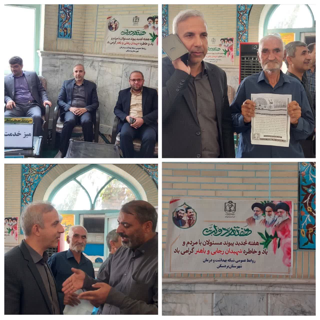 میز خدمت توسط شبکه بهداشت و درمان همراه با سایر ادارات شهرستان در محل مصلی نماز جمعه و در دومین روز از هفته دولت مستقر گردید و درخواست ها و مشکلات ارائه شده توسط نمازگزاران مورد بررسی قرار گرفت.