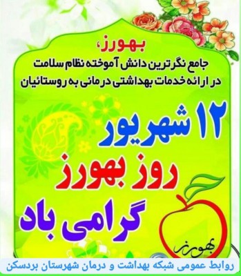 فرا رسیدن 12 شهریور که در تقویم سلامت به پاس گرامیداشت فعالیت های ارزنده سربازان خط اول ارائه خدمات بهداشتی و درمانی به آحاد مردم شریف روستایی و شهری کشور ، به نام روز بهورز نامگذاری شده است فرصتی برای تقدیر از زحمات این قشر شایسته و پرتلاش می باشد . درخشش چشمگیر موفقیت های نظام سلامت در عرصه بین المللی مرهون تلاش های خستگی ناپذیر انسان هایی است که عاشقانه و مخلصانه در ارائه خدمات پیشگیری از تهدیدات سلامتی برای یکایک آحاد جامعه روستایی در دورافتاده ترین مناطق جغرافیایی تلاش می کنند .