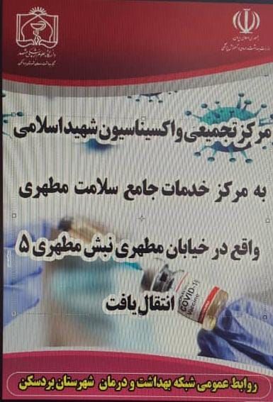 قابل توجه تمامی همشهریان عزیز با اهدا سلام به اطلاع می رساند با توجه به فراهم شدن شرایط واکسیناسیون کرونا در مرکز خدمات جامع سلامت مطهری از روز شنبه ۲۷ آذر ۱۴۰۰ مرکز واکسیناسیون تجمیعی شهید اسلامی به *مرکز خدمات جامع سلامت مطهری* واقع در بولوار مطهری نبش مطهری ۵ انتقال می یابد.ساعت کاری همه روزه به جز ایام تعطیلصبح ها از ساعت ۷:۳۰ الی ۱۴عصر ها از ساعت ۱۷ الی ۲۰ روابط عمومی شبکه بهداشت و درمان شهرستان بردسکن